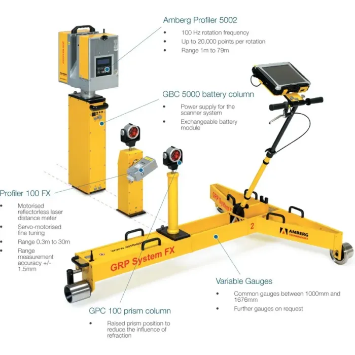 The Amberg GRP 3000 is the comprehensive system solution for point survey of clearance as well as track geometry survey. It is perfect for clearance profile surveying, catenary works, design surveys, and track geometry surveys.